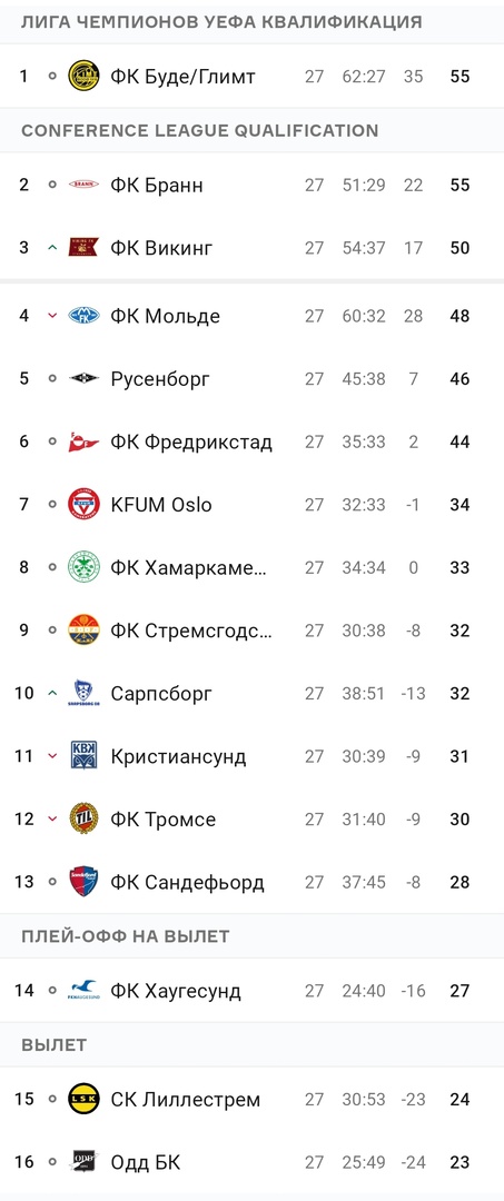 Вашему вниманию актуальная таблица норвежской Элитсерии после 27-ми туров чемпионата и за 3 тура до конца сезона. Источник: OneFootball | |