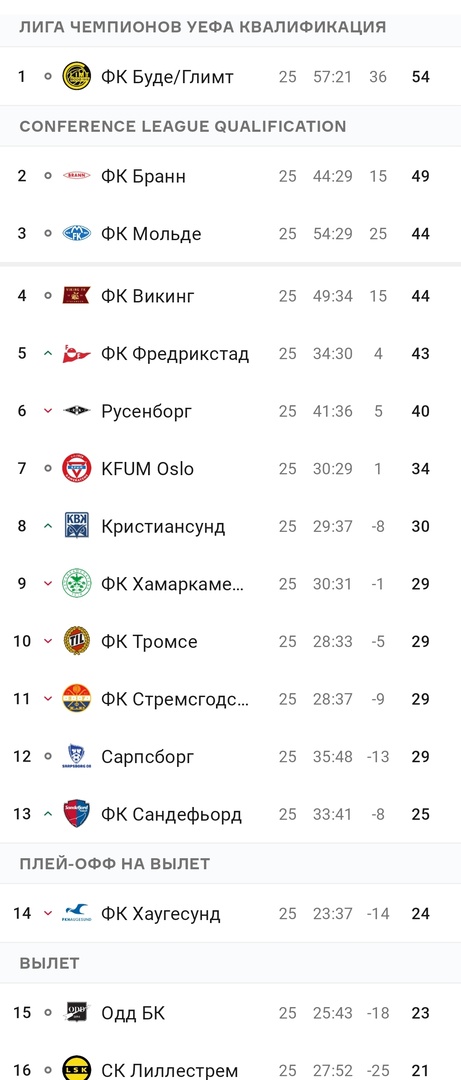 Вашему вниманию актуальная таблица Элитсерии после 25-го тура. 1. "Будё-Глимт" - 54 очка; 26-й тур Суббота 26 октября: Воскресенье 27 октября: "ХамКам" - "Кристиансунн" 19:00; Понедельник 28 октября: "Будё-Глимт" - "Русенборг" 21:00. Источник: OneFootball | |