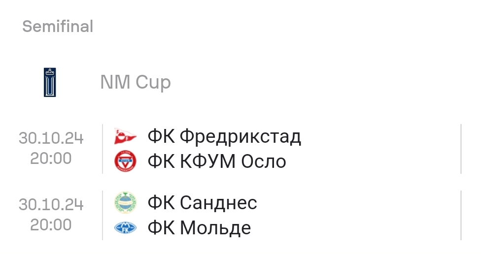 Вчера, 6 октября, определились все полуфиналисты Кубка Норвегии по футболу. Исходя из сетки, "Фредрикстад" примет "КФУМ", а "Мольде" вновь сыграет в гостях. На этот раз, против единственного оставшегося представителя ОБОС-лиги - клуба "Санднес". Обе встречи состоятся 30 октября в 20:00 по мск. Источник: sofascore.com | |
