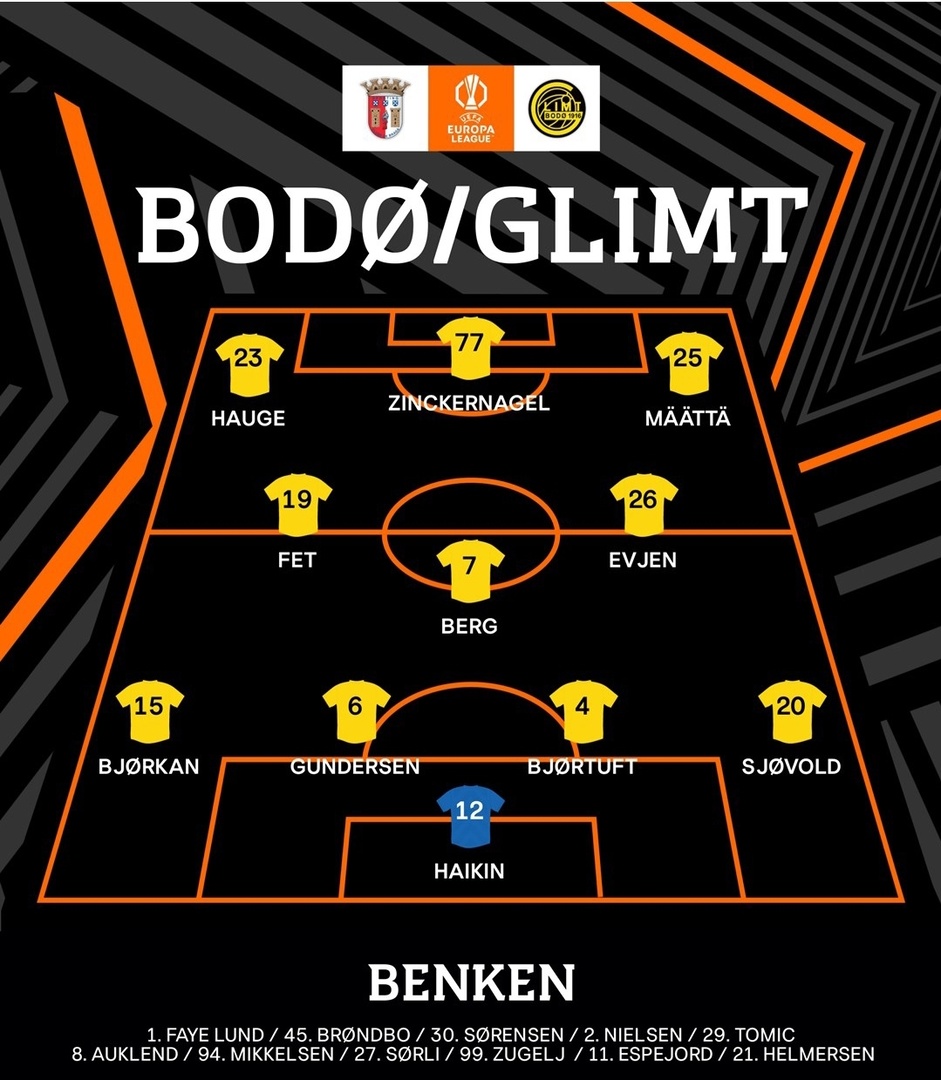 В рамках 3 тура Лиги Европы состоится матч между командами "Брага" и "Будё-Глимт". Норвежцы объявили стартовый состав. Источник: bodoglimt | |