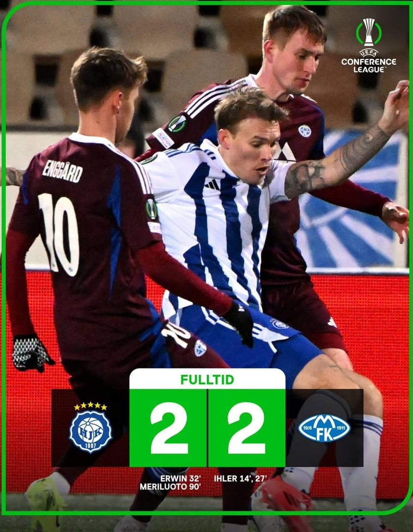 Завершился матч 5-го тура Лиги конференций между финским клубом "Хик" и норвежским "Мольде", счёт 2:2. У гостей автором дубля стал Фредерик Ихлер (14', 27'), а у хозяев голы на счету Эрвина на 32' и Мерилуото на 90'+. Надо отметить, что "Хик" отыгрался, проигрывая по ходу встречи 0:2. Источник: moldefotballklubb | |
