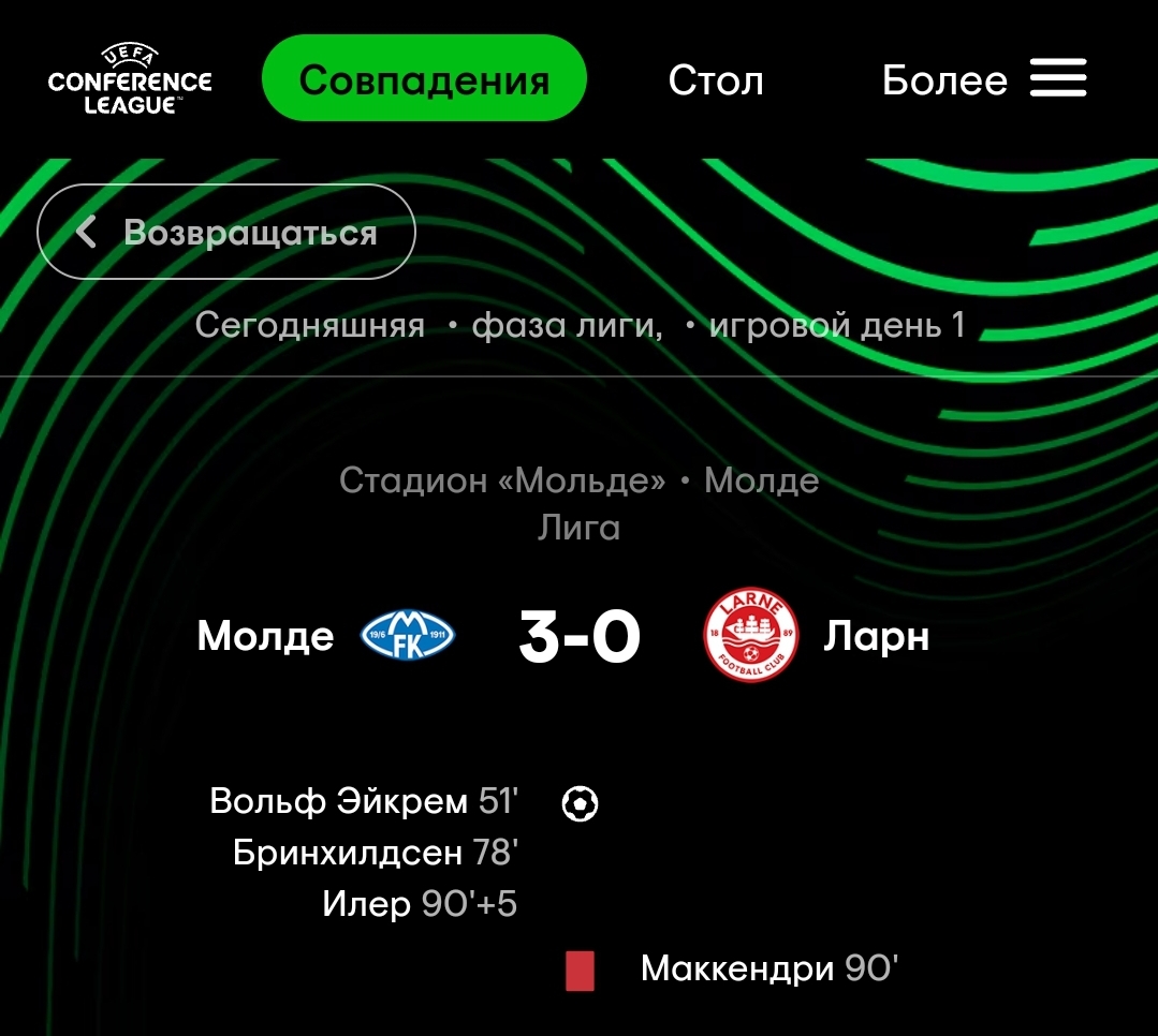 В матче первого тура общей стадии Лиги конференций норвежский "Мольде" принимал клуб из Северной Ирландии "Ларне", в котором хозяева поля одержали разгромную победу со счётом 3:0. Первый гол случился на 51-й минуте встречи и он за авторством Магнуса Эйкрема, капитана и лидера "Мольде". Счёт в матче увеличил Ола Бринхильдсен на 78-й минуте. Ну а точку в матче поставил датский форвард Фредерик Ихлер. Итог - 3:0, победа норвежской команды! Хорошее начало турнира. Источник: uefa.com | |