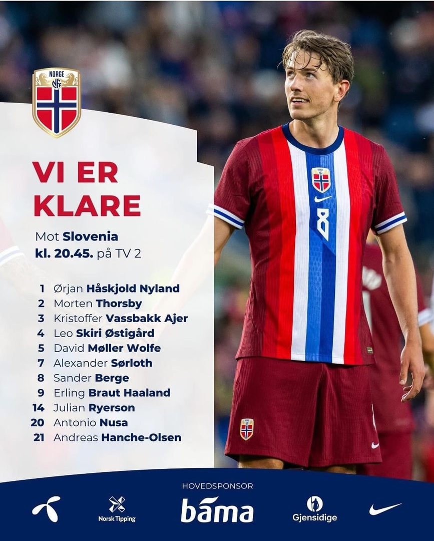 Сборная Норвегии по футболу объявила стартовый состав на матч против команды Словении в рамках Лиги наций УЕФА, группа В3. Встреча начнётся в 21:45 по мск. Норвежцы сыграют в привычной для себя схеме 4-4-2. Место в воротах займёт Ньюланн. Полевые игроки: Торсби, Айер, Эстигор, Вольф, Берге, Рийерсон, Нуса, Ханче-Ольсен, и в атаке пара Холанн-Сёрлотт. Источник: herrelandslaget | |
