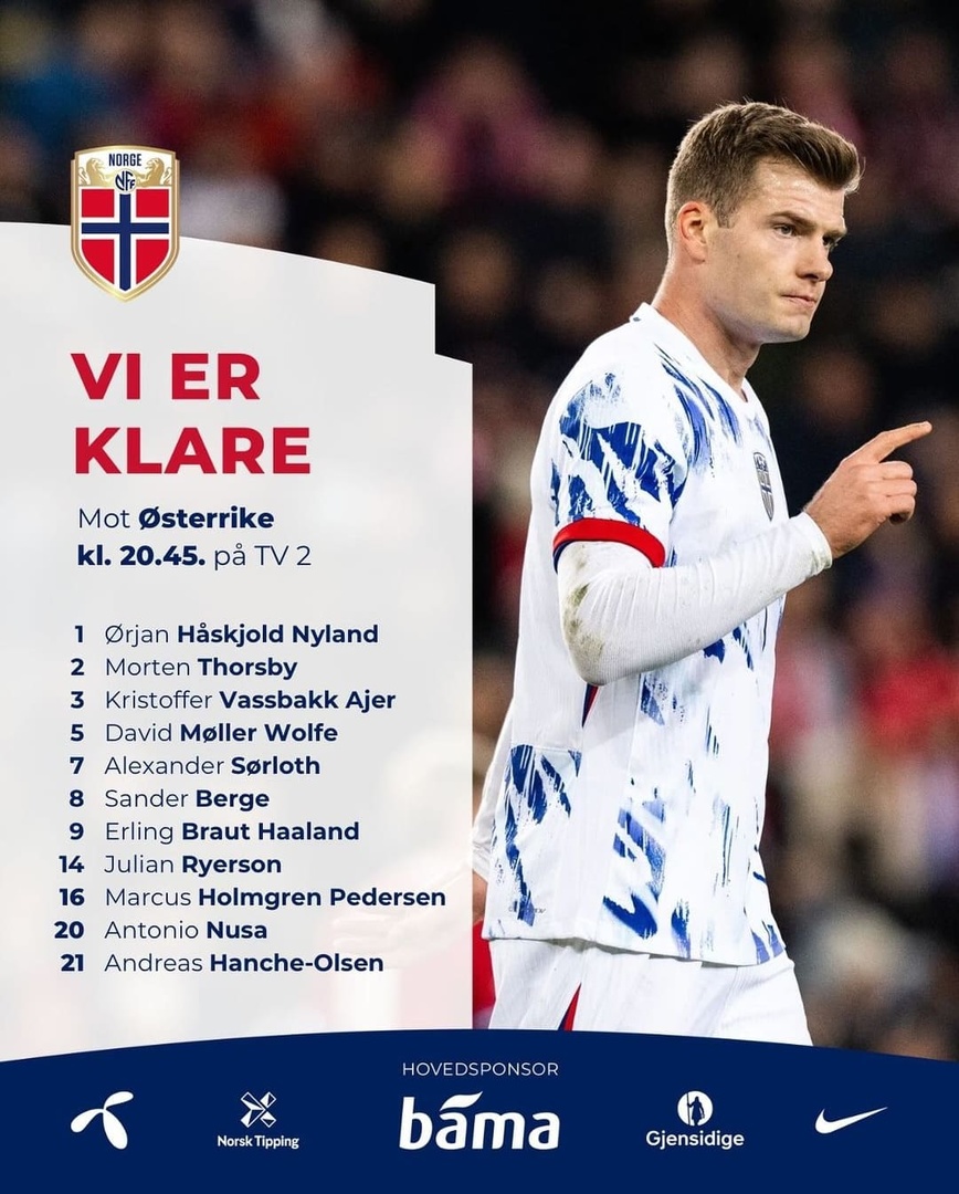 Национальная сборная Норвегии в своём официальном профиле в социальной сети объявила стартовый состав команды на гостевой матч против Австрии. Начало встречи назначено в 21:45 по мск. Источник: herrelandslaget | |